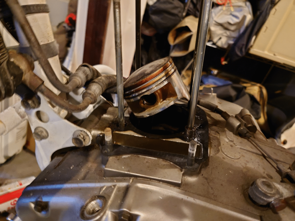 シリンダーヘッド、シリンダー本体を外すとピストンが出てくる。
