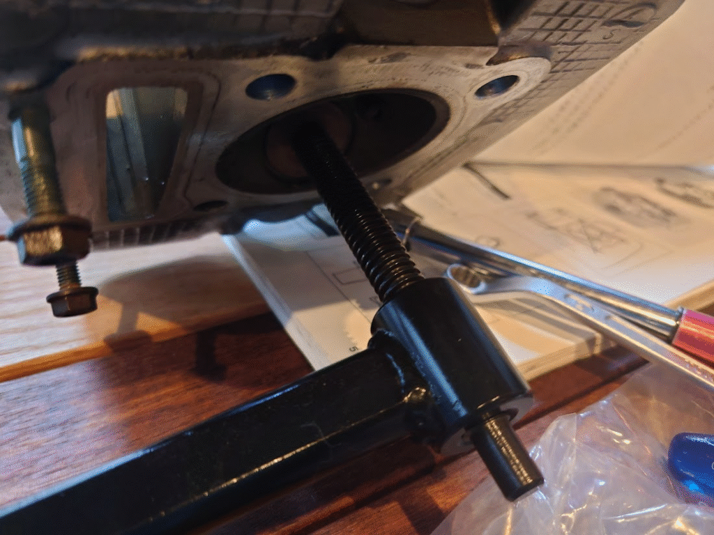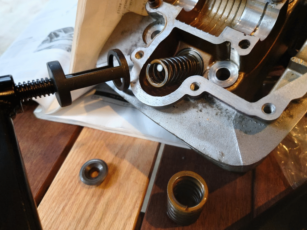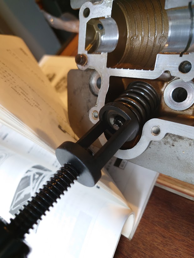 ここからさっきのバルブスプリングコンプレッサーを使ってバネだけを下におろし、ピンを入れていくぞ。
