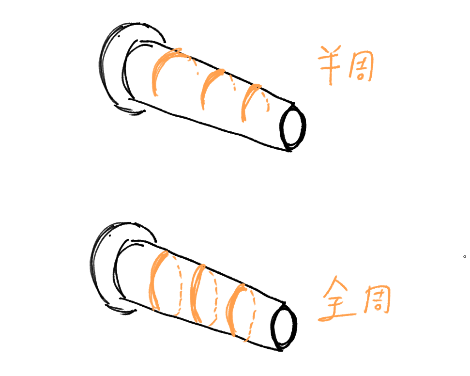 図のように半周は半分だけ(手のひらだけ)、前週は全体(指先まで)が対象となる。