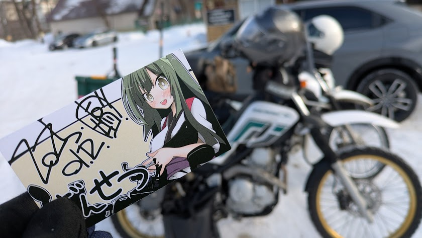 今回は4輪で参戦とのことで、宗谷岬は関係なく、年末年始にデカいカメラ担いで道東で動物の写真を撮りまくっているとのこと。