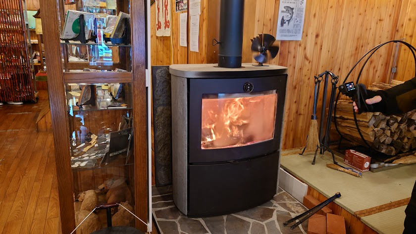 店内にはデカい薪ストーブがあったりして温かい。